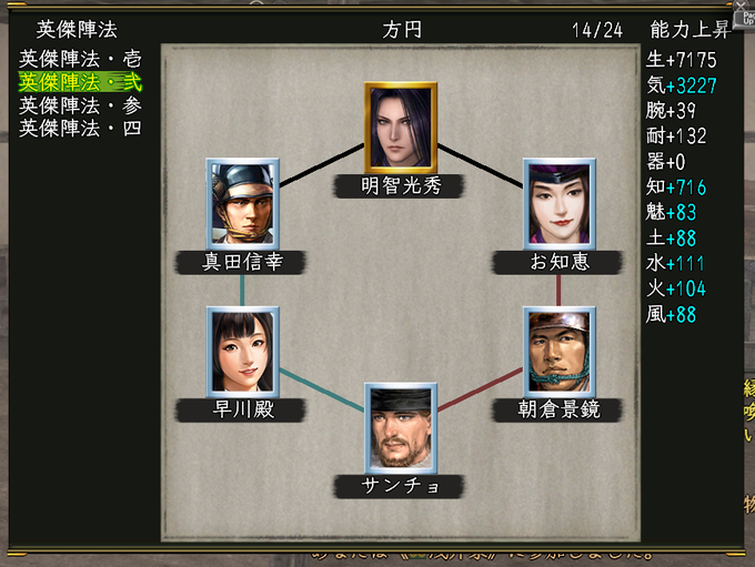 英傑陣法| 真田信幸-明智光秀(十七)-お知恵-朝倉景鏡-サンチョ-早川殿 知力 X Facebook はてブ LINE コピー 2024.06.24 うちのおんもはお知恵のみ3凸でここまで伸びてるぅw早川さんはさすがにこの前の等級3のやつ、コインで買ってそろえたw pic.twitter.com/z0thtBte0E— ももち ちくわ@コーテク信者 (@gil_momochiku) April 23, 2024
