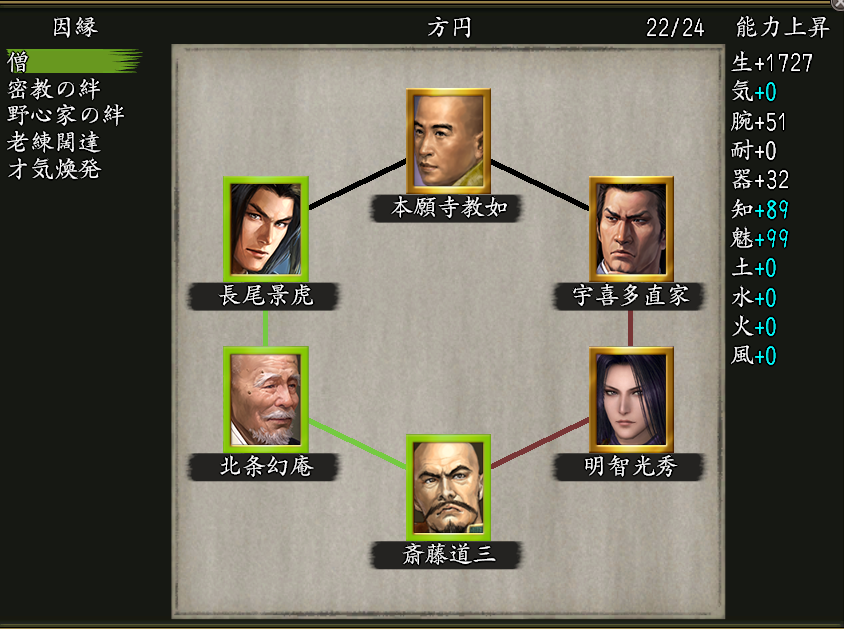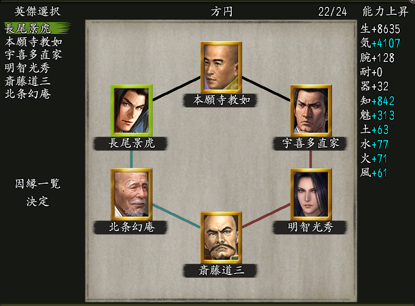 英傑陣法| 長尾景虎-本願寺教如-宇喜多直家-明智光秀(十七)-斎藤道三-北条幻庵