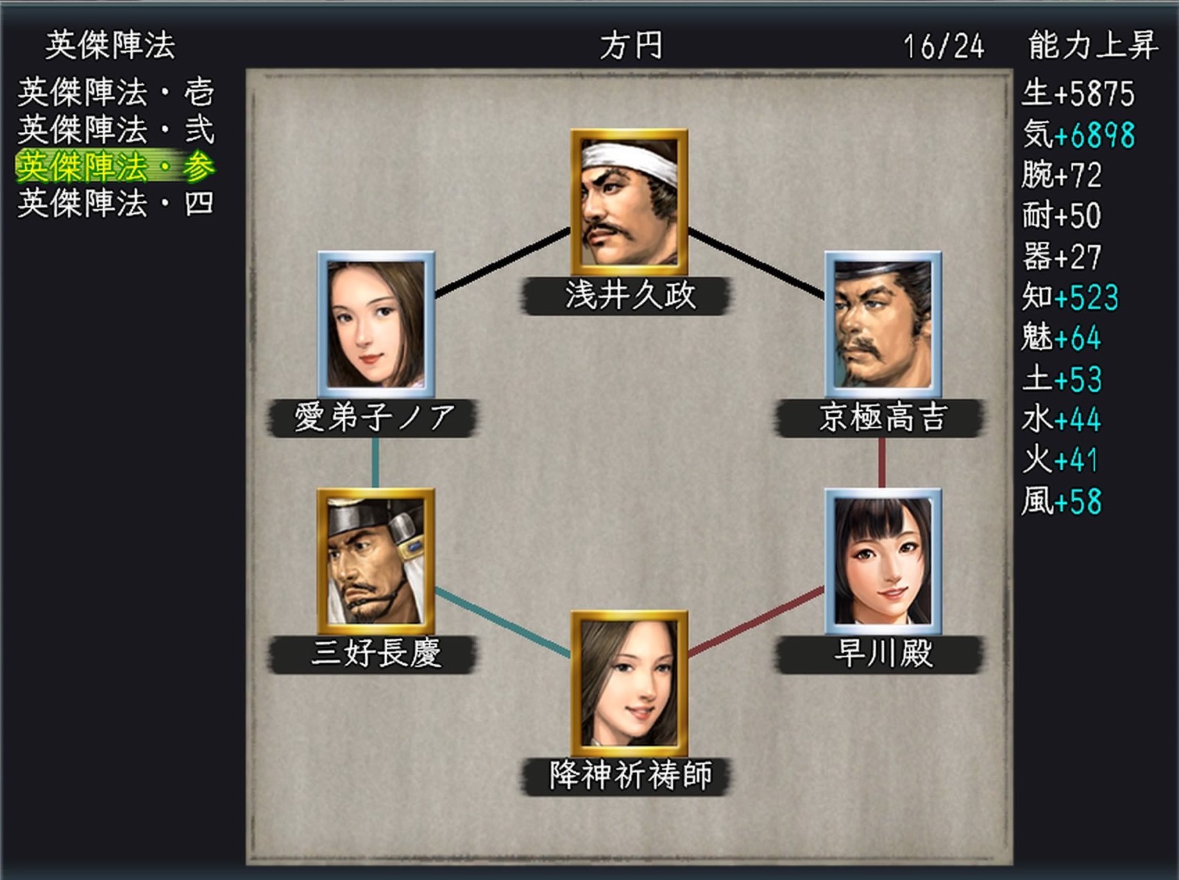 英傑陣法| 愛弟子ノア-浅井久政-京極高吉-早川殿-降神祈祷師-三好長慶 気合 X Facebook はてブ LINE コピー 2024.06.30 MSQRさんいつもありがとうございます😊 今朝は時間があったので、久しぶりに陣法をいじってみました(桜井さんのサイトを参考にしました。ありがとうございます)。最近選抜鈴などを配ってくれた事もあり、すんなり組めた気がします。後は上がるステの鬼神石の作成。これが1番時間を費やすので、めんどくさがり屋な私は苦労しました。。 pic.twitter.com/bouskXUEVJ— マスキュリン (@masculine_357) June 30, 2024 ↓ベースはASHNさんからの頂き物です🙏 英傑陣法| 愛弟子ノア-足利義昭-粟津元隅-早川殿-降神祈祷師-明智光秀追記2025/2/19早川殿は妙玖でも可能です!
