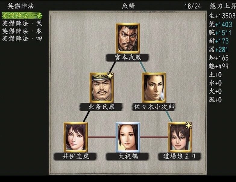 英傑陣法| 宮本武蔵-佐々木小次郎(涼)-道場娘まり(和装)-大祝鶴-井伊直虎-北条氏康(獅子)