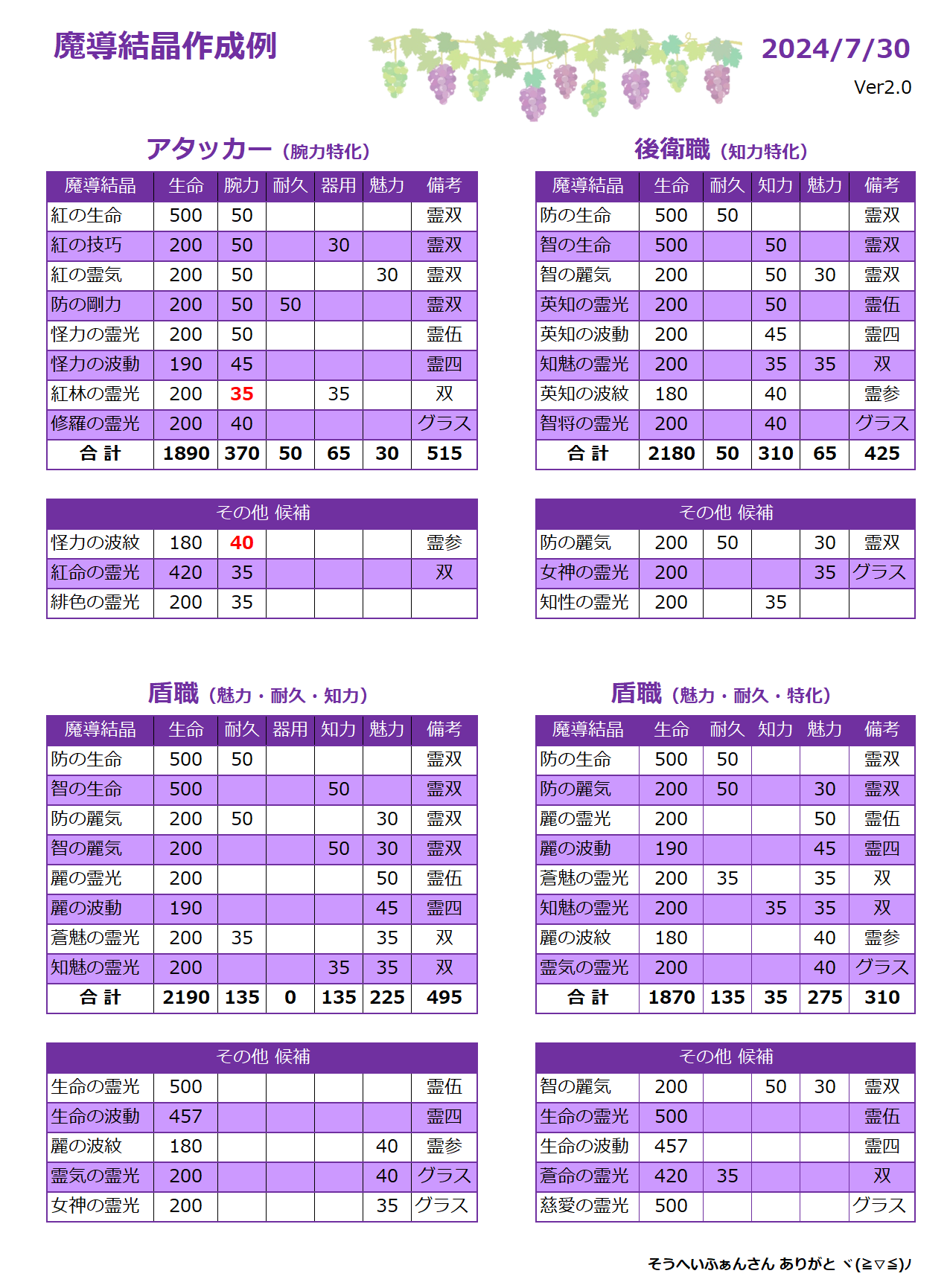 “乱雲動天”アップグレードで生命と気合の上限が拡張されました。私のキャラクター達も生命が上限だった65535以上となるので、いくつかの魔導結晶を差し替え🤗参考までに前回の表をアップデートさせて頂きました。生命モリモリで作るか?赤帯が付かない能力重視で作るか?は皆さんのお好みで加減して頂けると幸いです。