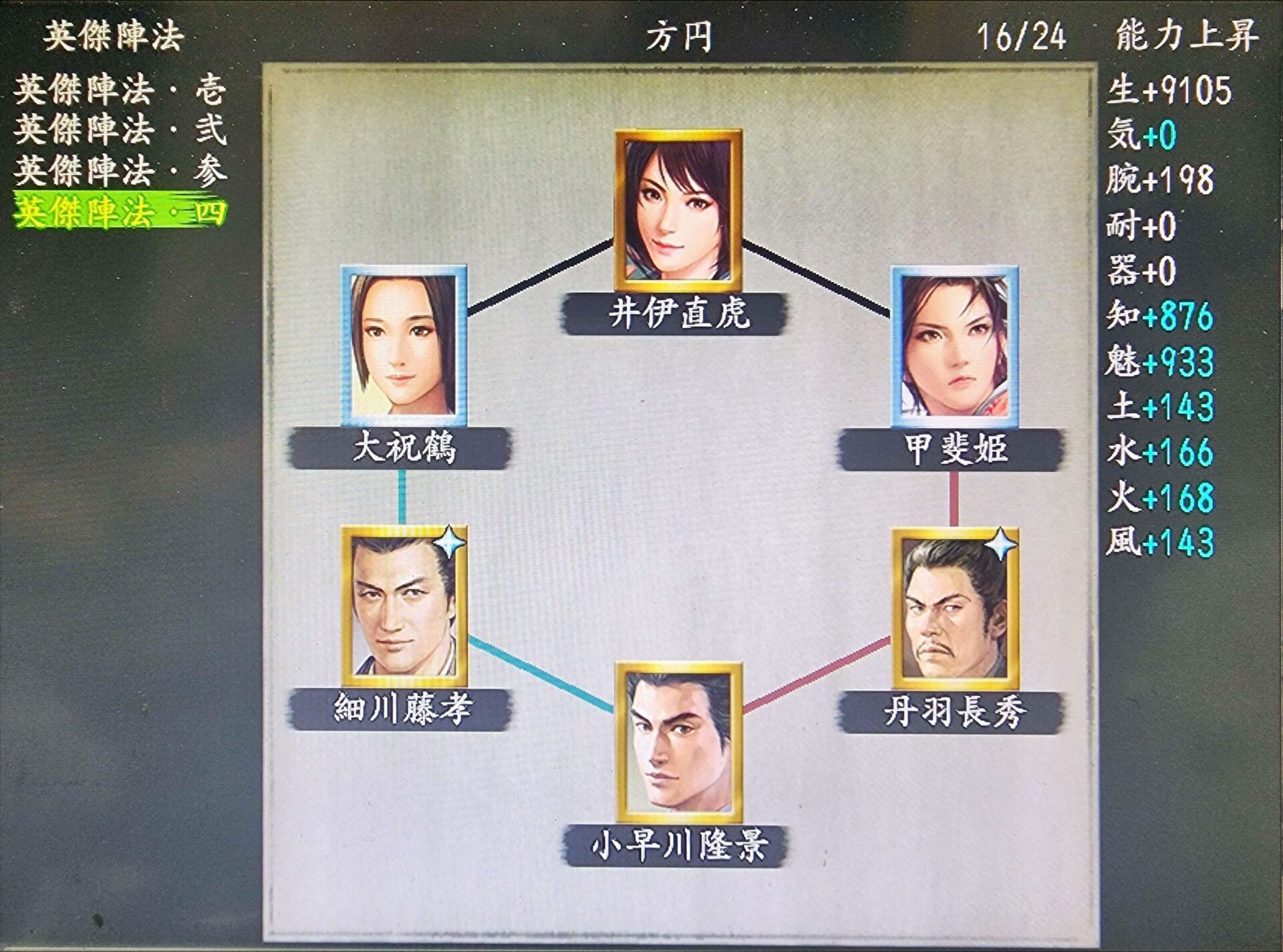 英傑陣法| 大祝鶴-井伊直虎-甲斐姫-丹羽長秀(風雲)-小早川隆景-細川藤孝(立役) 知力 X Facebook はてブ LINE コピー 2024.11.15 じゃむさん 転載のご許可ありがとうございますm(_ _)m 転載じゃむ&がちゃのYoutubeチャンネル じゃむ&がちゃ信長の野望onlineの動画をあげていく予定です。天翔サーバー初期から始めて10年近く引退したのち2020年に復帰しました。旧メインキャラ:タイガーさん現在メインキャラ:邪夢御路散、牙茶瀕