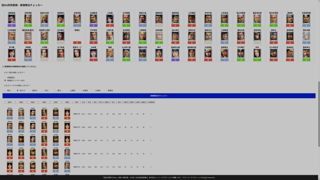 僧兵ちゃんさんの英傑陣法ツール や私のサイトも含めて様々な方法で英傑陣法を探す事ができるんだ~とわくわくして日々過ごしてます。