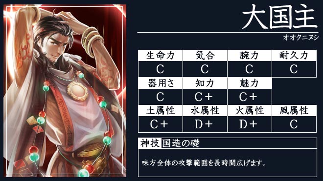 - 主要な神(アマテラス、イザナギ、イザナミ、スサノオ、オオクニヌシ、サクヤヒメ、タケミカヅチ、フツヌシ、スクナヒコナ、アメノミナカヌシ等)はほぼ全て軍神として実装されています。